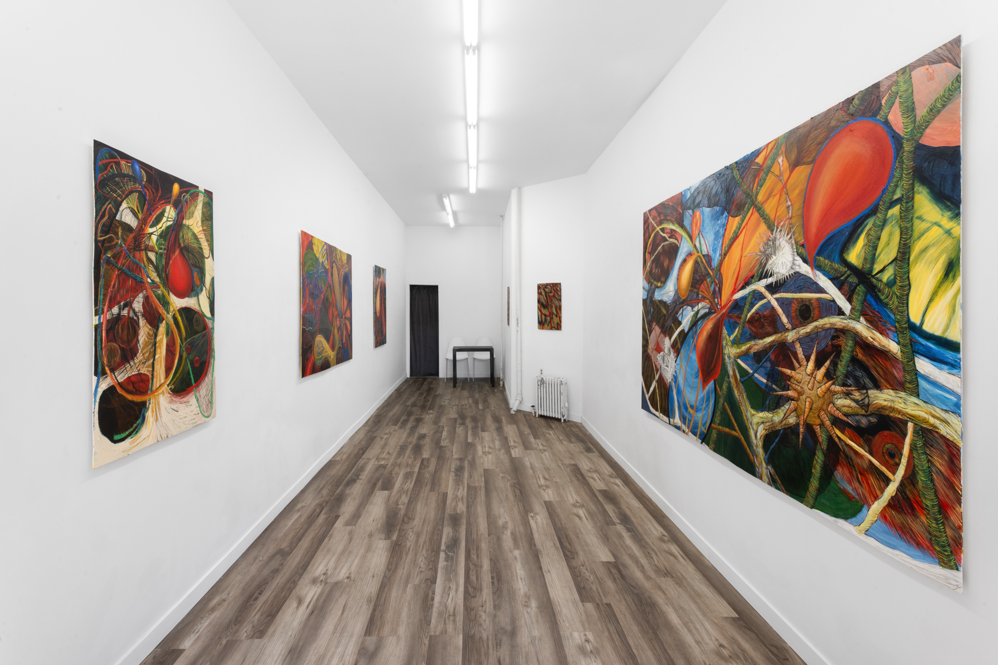 The works in this exhibition combine observational drawing with biomorphic abstraction, interlacing the kind of illustration most familiar from natural history guides with bodily shapes that hover on the edge of the appealing and the grotesque. Hovering between abstraction and figuration, many of the paintings seem caught in the process of transformation; goopy oil stick melts into thinly rendered linework, and flora and fauna waver in and out of perception. Cut with a jigsaw, the edges of the panels undulate slightly, like leaves or sheets of paper.